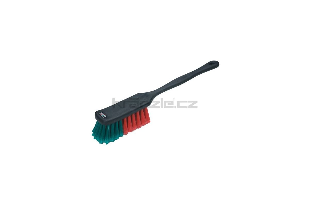 Ruční kartáč na mytí vozidel z černého pěnového polypropylenu s měkkými červeno zelenými štětinami. Tyto kartáče s dlouhou odolnou rukojetí se používají zejména v servisních opravnách vozidel.