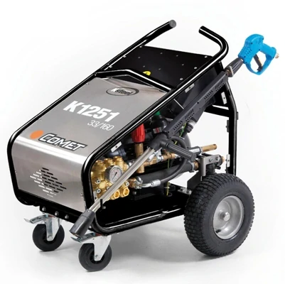 Řada K 1001 / K 1251 / 1501 je ve všech ohledech tím nejlepším, co Vám může stroj značky Comet nabídnout. Zesílená varianta vysokotlakého čerpadla (s možností přivádět do vstupu vodu o teplotě až 85°C) nejvyšší řady pro to nejnáročnější použití - samozřejmostí jsou keramické písty, bronzové vedení pístů, mosazná hlava čerpadla, vstupní filtr s funkcí samočištění, manometr, zpožděný Total-Stop, velká pneumatická kola pro snadný pohyb, regulační blok s by-passem či pomaloběžný motor s 1400 ot./min. Stroj je velmi dobře přizpůsoben použití v náročných provozech: robustní kovový rám, nerezový kryt čerpadla a motoru, bržděná otočná kolečka vpředu a již zmíněná velká pneumatická kola vzadu. Průtok vody s hodnotou 1080 l./hod. při tlaku až 350 bar je vynikající pro náročné práce v průmyslovém odvětví. Na přání možno dodat variantu s navíjecím bubnem nebo variantu s celonerezovou konstrukcí.